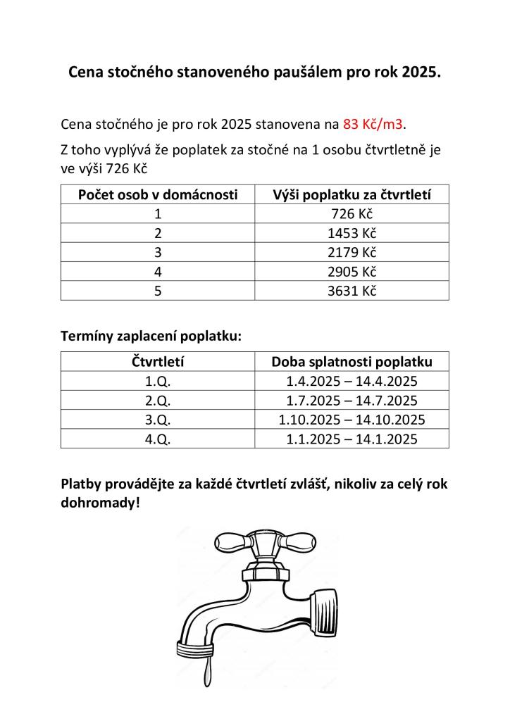 Cena stočného pro rok 2025 byla stanovena na 83 Kč za m3. Poplatek za stočné pro jednu osobu činí 726 Kč čtvrtletně. Je důležité platit poplatky za každé čtvrtletí zvlášť, nikoliv najednou za celý rok.