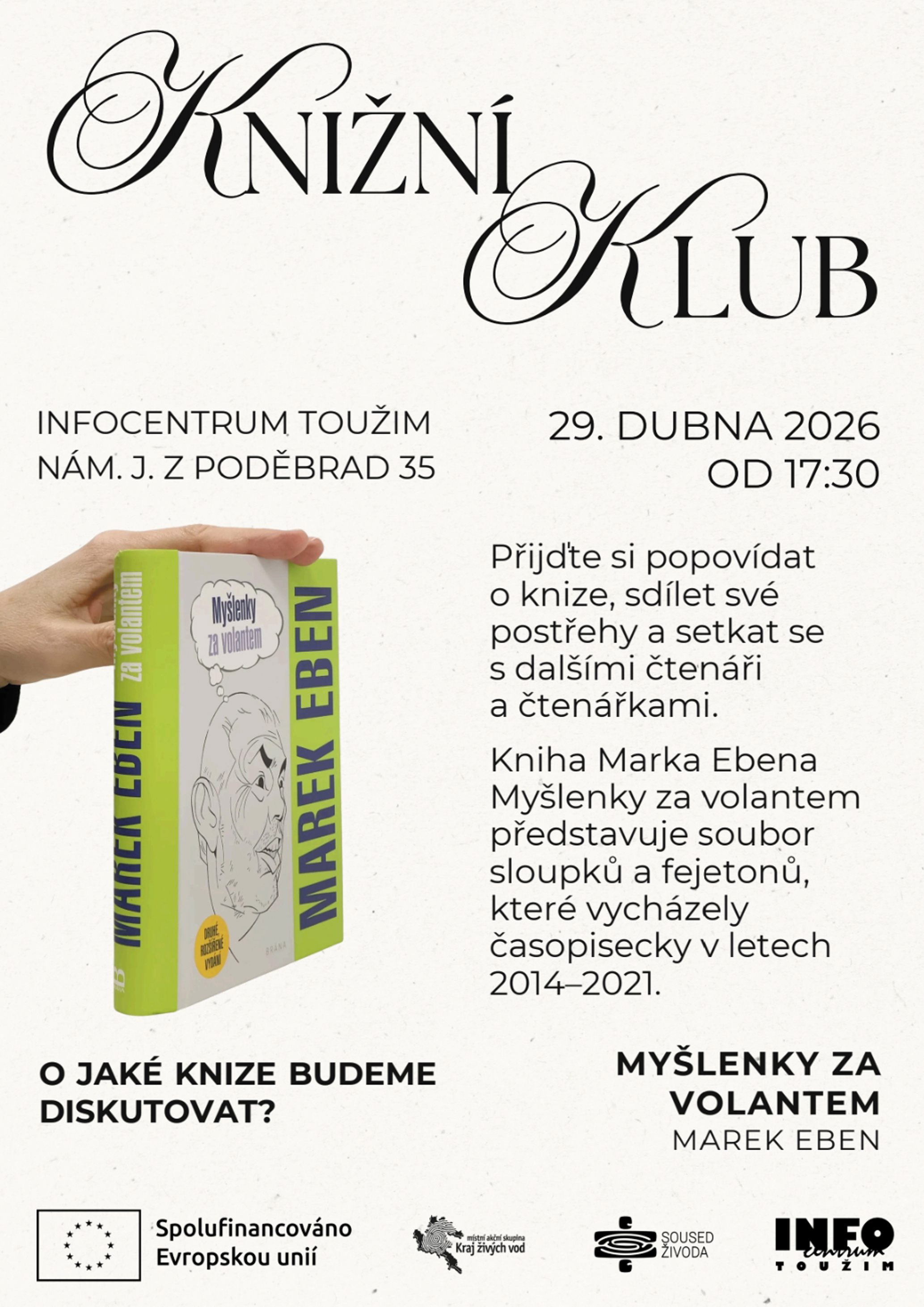 Dne 29.4.2026 se od 17:30 hod. koná v Infocentru Knižní klub - povídání o knize Myšlenky za volantem od Marka Ebena.